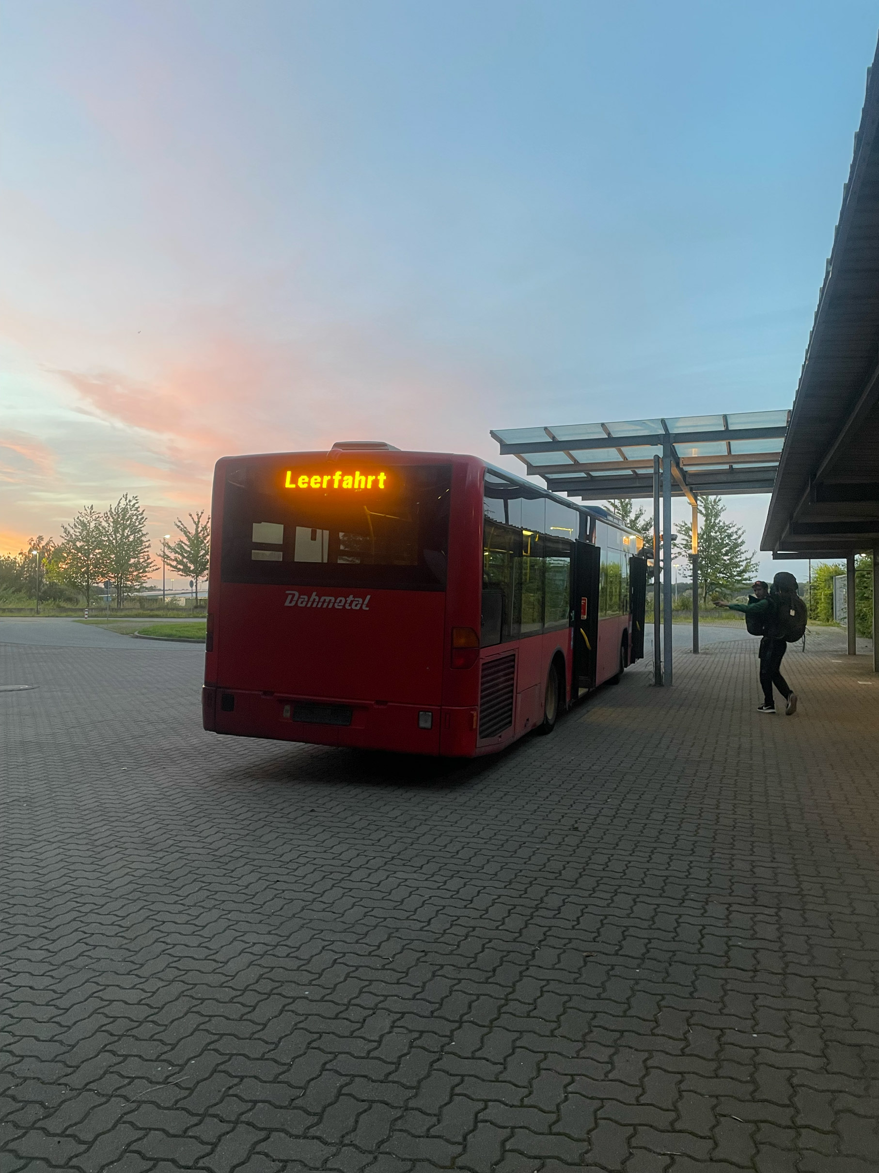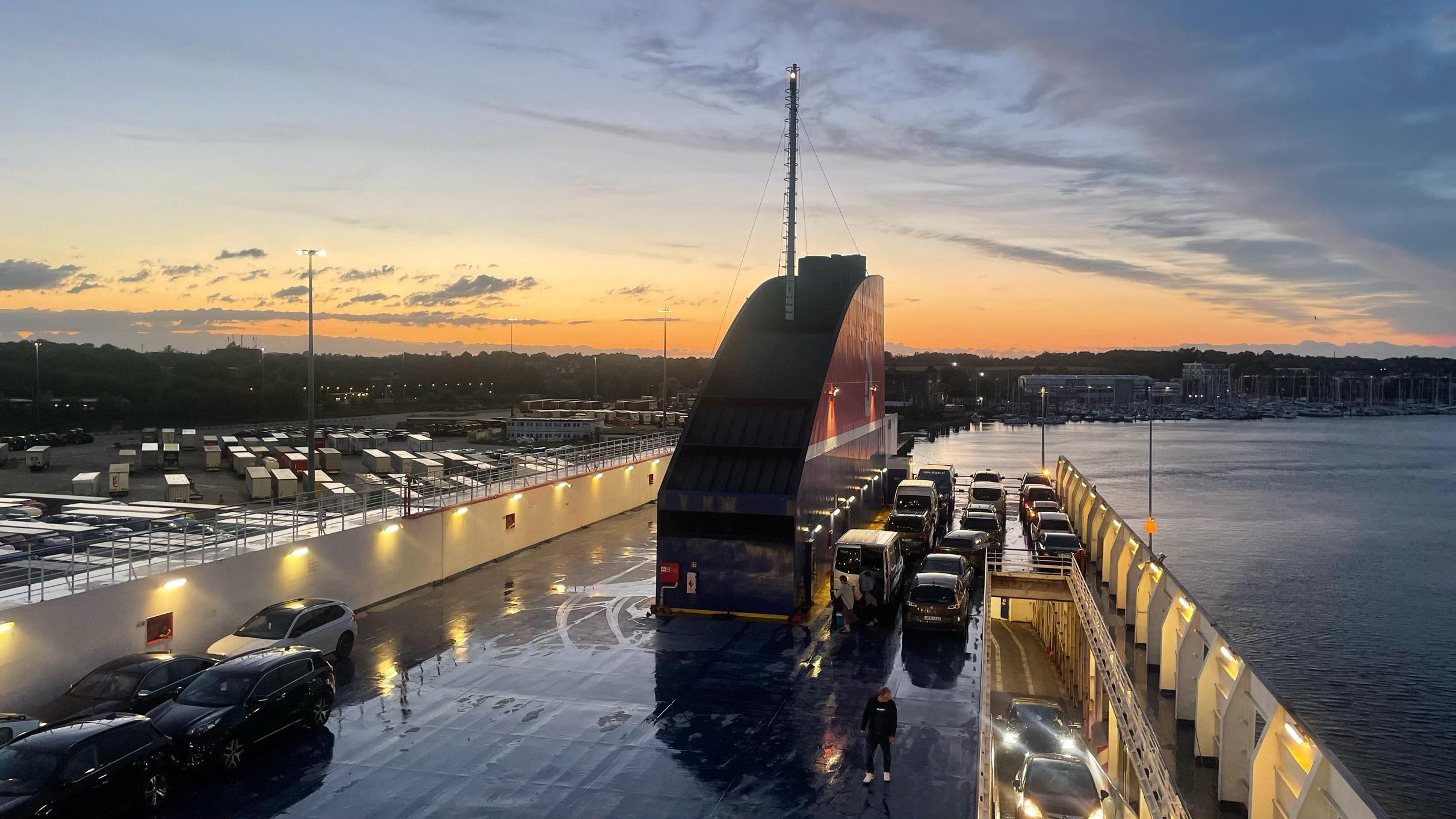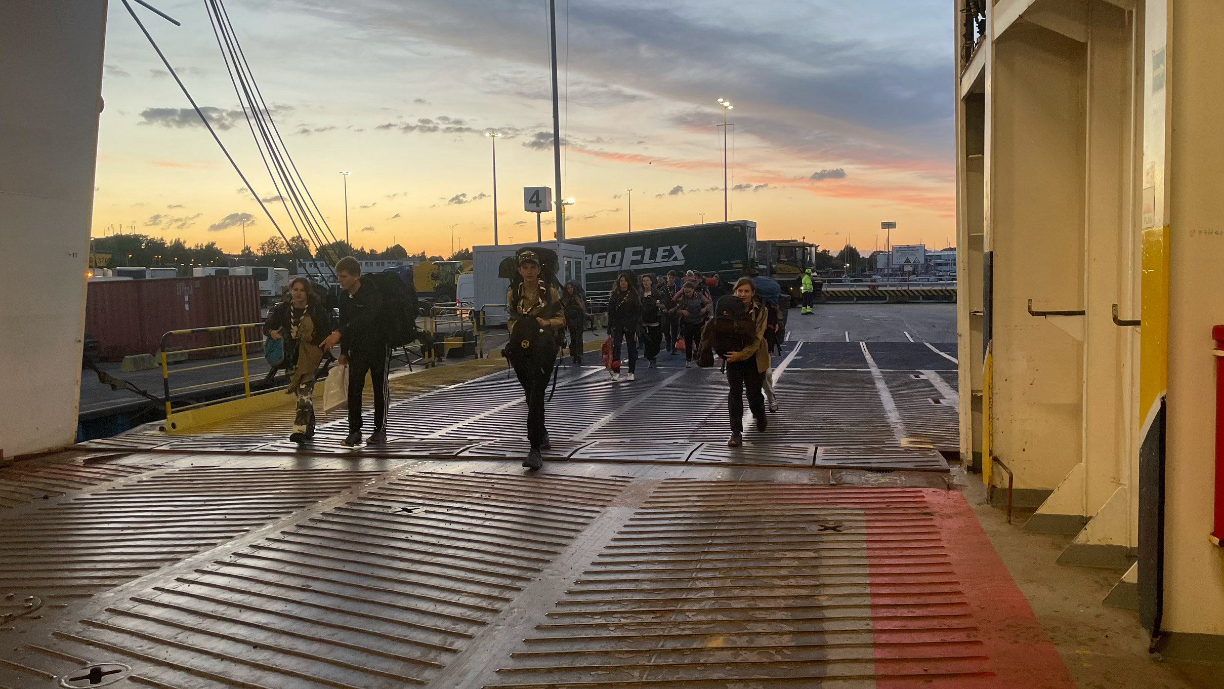 Schliesslich kommt ein wenig Hektik auf. Der Bus zur Fähre ist da. Für die nächsten 24 Stunden heisst es: Gottstatt Ahoi! ⛴️ Einquartiert zwischen Restaurant und Treppenhaus haben wir unsere Sitzplätze in Beschlag genommen. Inzwischen ist es Mitternacht und immer noch fahren Autos auf die Fähre. Gespannt warten wir an Deck auf das Dröhnen der Maschinen und das Ablegen. Lettland, wir kommen. 👋🏻